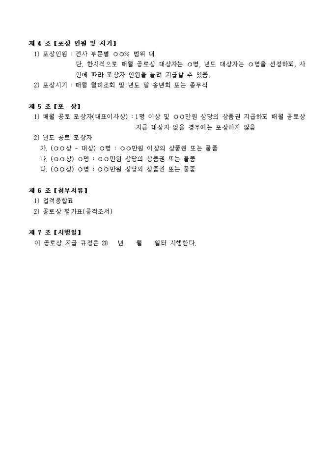 공로상 실시 목적, 포상 대상자 추천, 포상 추천자 평가방법 등 7개 조항으로 구성되어있는 공로상 지급 규정입니다.