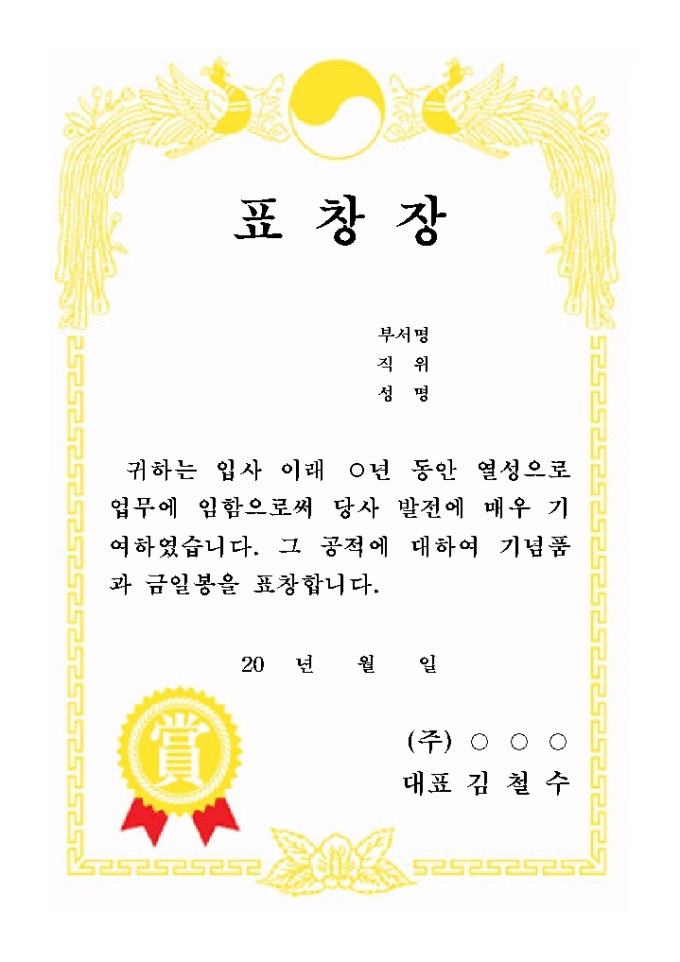 9,000원/월근속한 직원에 수여하는 표창장입니다.