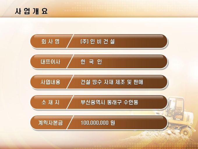 건설자재 사업계획서로써 목차는 1.사업개요 2.제품소개 3.시장분석 4.사업운영계획 5.재무계획으로 구성되어 있습니다.