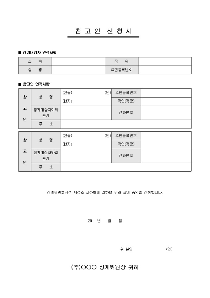 9,000원/월징계위원회 회의시 참석할 참고인에 대한 내역을 기록하고 참석을 신청할 때 사용하는 참고인 신청서입니다. 징계대상자 인적사항, 참고인 인적사항 등의 항목으로 구성되어있습니다.