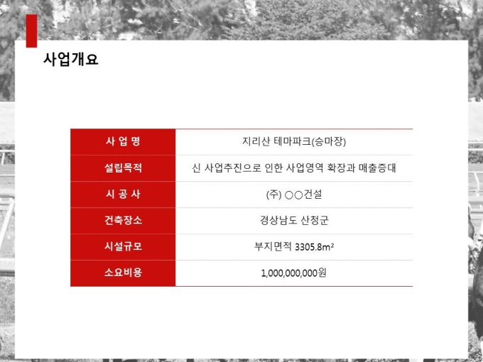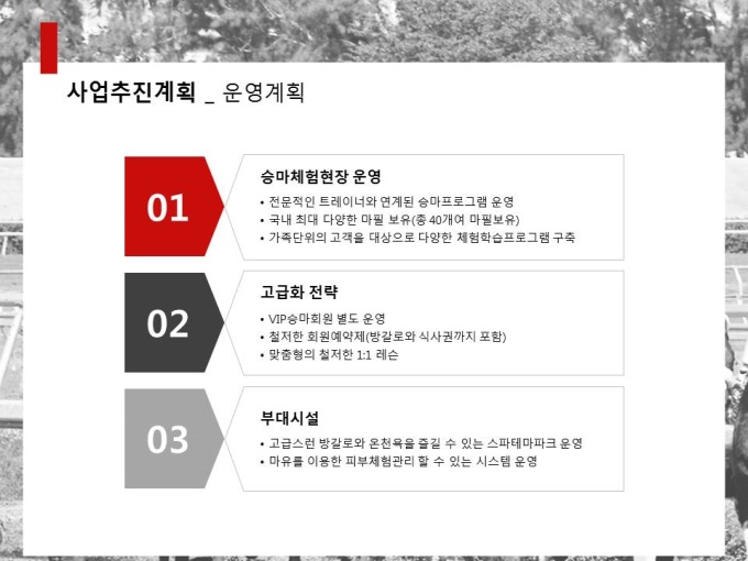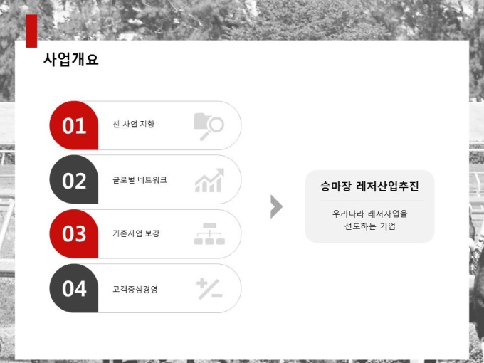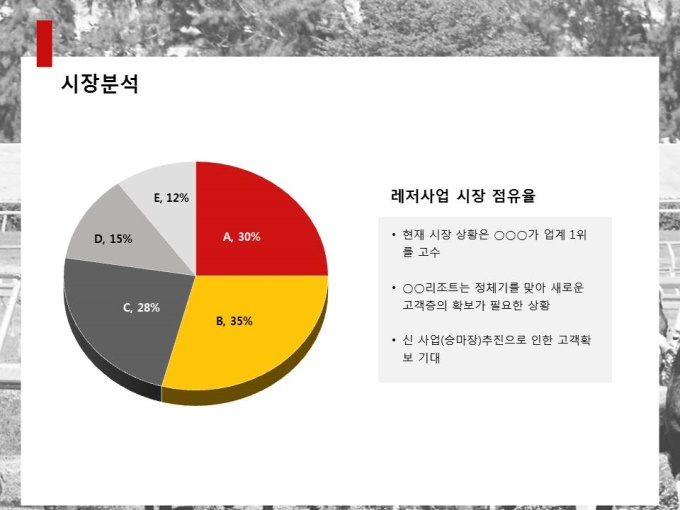레저사업계획서로써 목차는 1.회사현황 2.사업개요 3.시장분석 4.사업추진계획 5.재무계획으로 구성되어 있습니다.