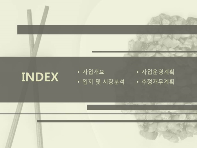 외식업 사업계획서로써 목차는 1.사업개요 2.입지 및 시장분석 3.사업운영계획 4.추정재무계획으로 구성되어 있습니다.