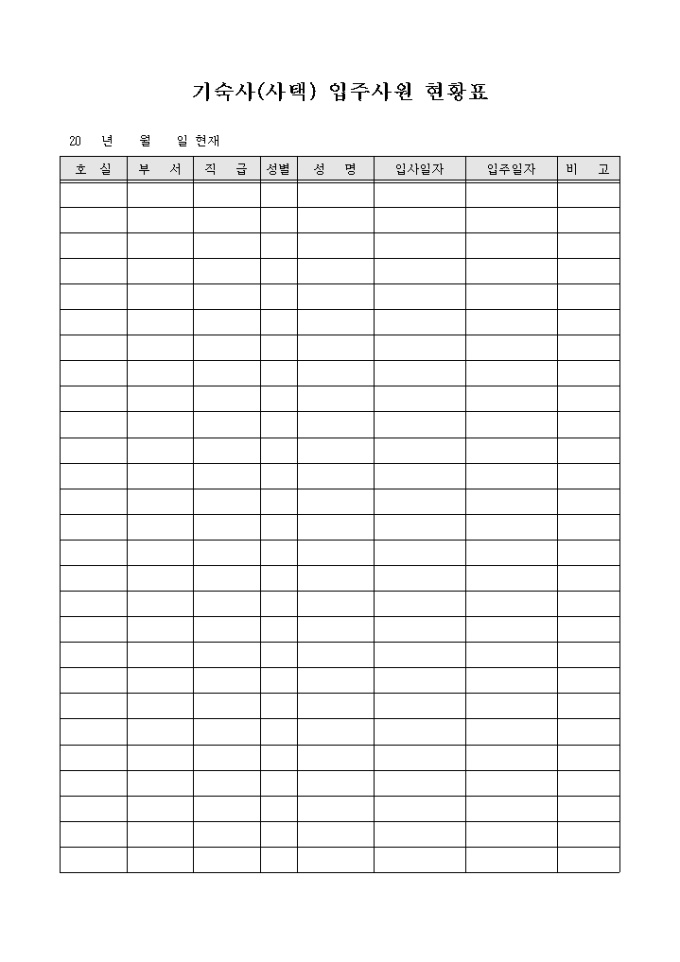 9,000원/월회사에서 운영하는 기숙사, 사택에 입주하고 있는 사원의 현황을 관리하여 원활한 운영을 할 수 있게끔 제작된 서식입니다.