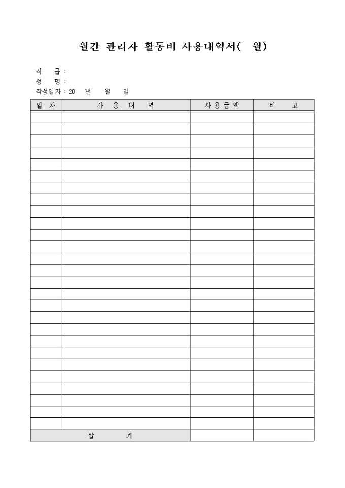 9,000원/월회사에서 지급하는 관리자 활동비의 사용 내역을 회사에 보고하고자 할 경우 사용할 수 있게끔 제작된 서식입니다.
