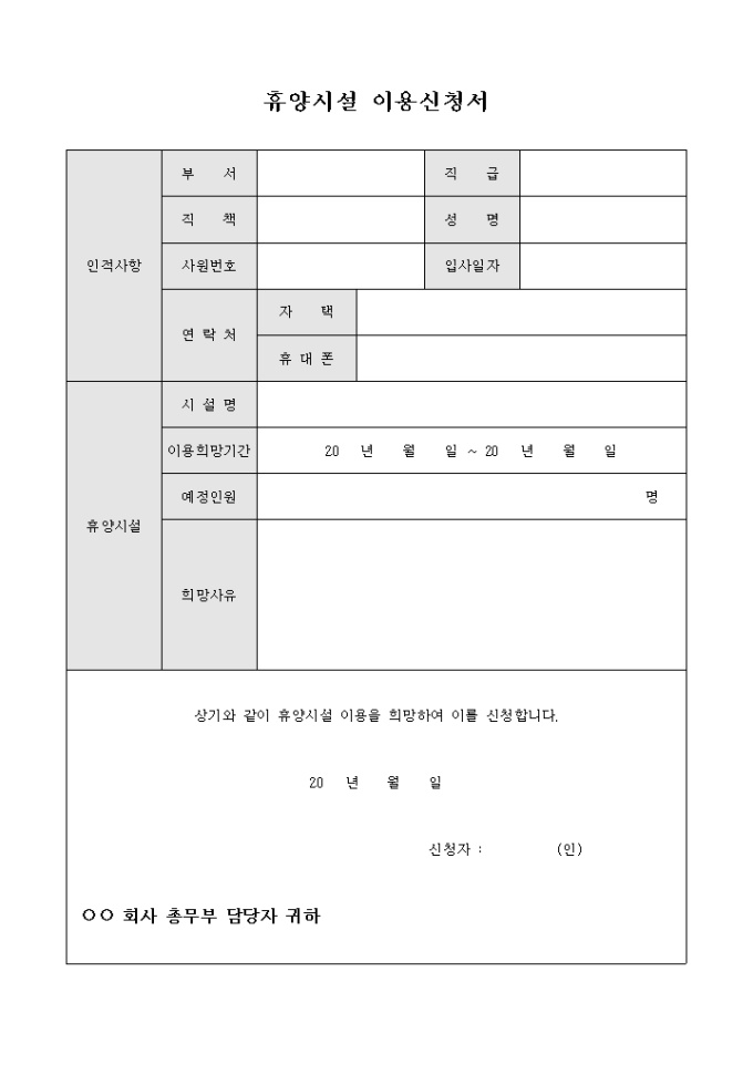 회사에서 관리하는 휴양시설의 이용을 희망하여 이를 신청하고자 할 경우 사용할 수 있도록 제작된 서식입니다.