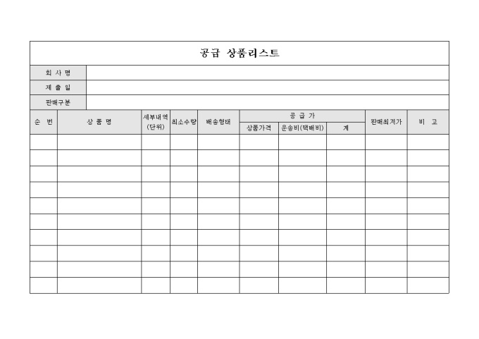 회사에서 공급하는 상품에 대해 최소 판매 단위와 배송형태등을 기록한 공급상품 리스트 입니다.