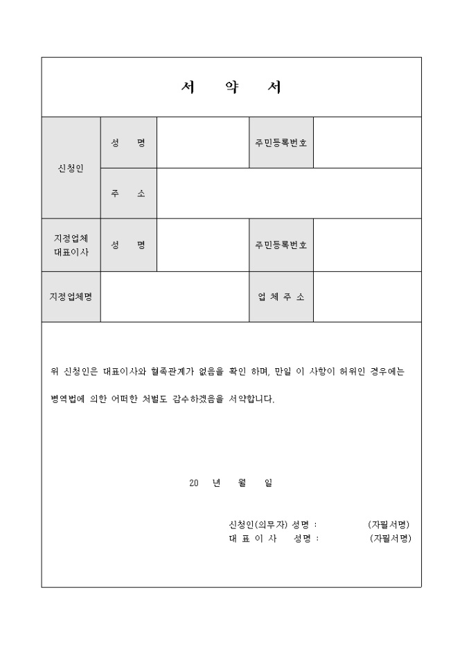 방위산업체에 근무시 작성하는 서약서 입니다. 회사에 가족이 근무하지 않음을 서약하는 내용 입니다.