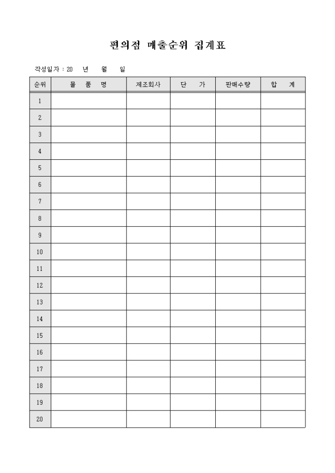 일간 편의점에서 매출순위가 상위에 있는 품목 20개를 기입하여 현황을 정리할 수 있도록 제작된 서식입니다.