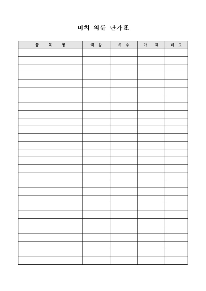 해수욕장 등지에서 해수욕을 즐길 수 있는 간단한 옷차림을 판매하는 경우 물품에 대한 정보 및 단가를 기입할 수 있게끔 제작된 서식입니다.