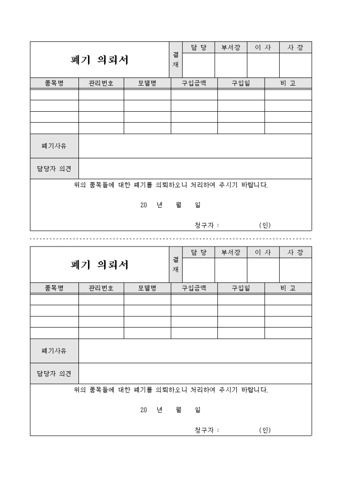 9,000원/월회사의 부서에서 사용하고 있는 비품이나 장비에 고장 등의 사유로 인하여 폐기를 의뢰하기 위해 작성하는 폐의뢰서 양식입니다.