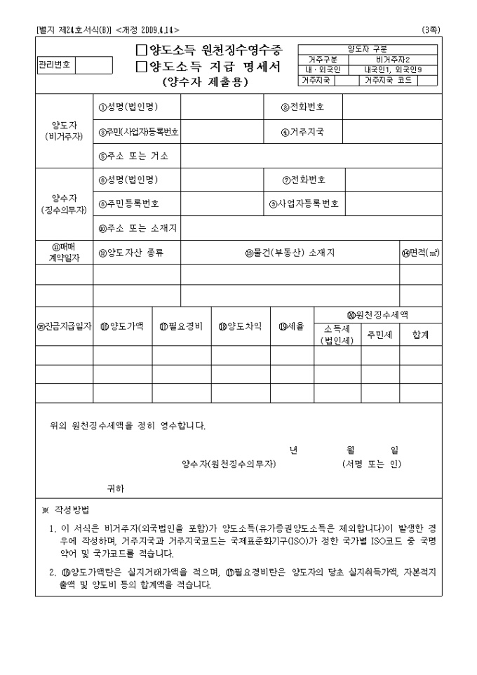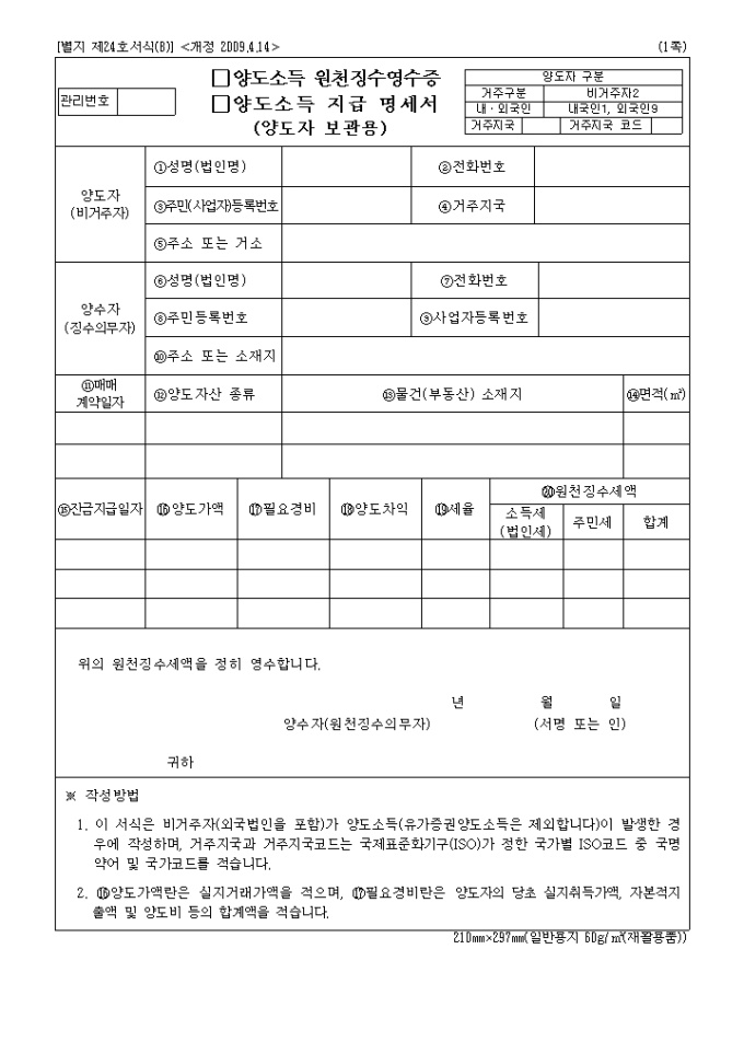 양도소득 원천징수영수증 및 양도소득 지급명세서(개정 2009.4.14)