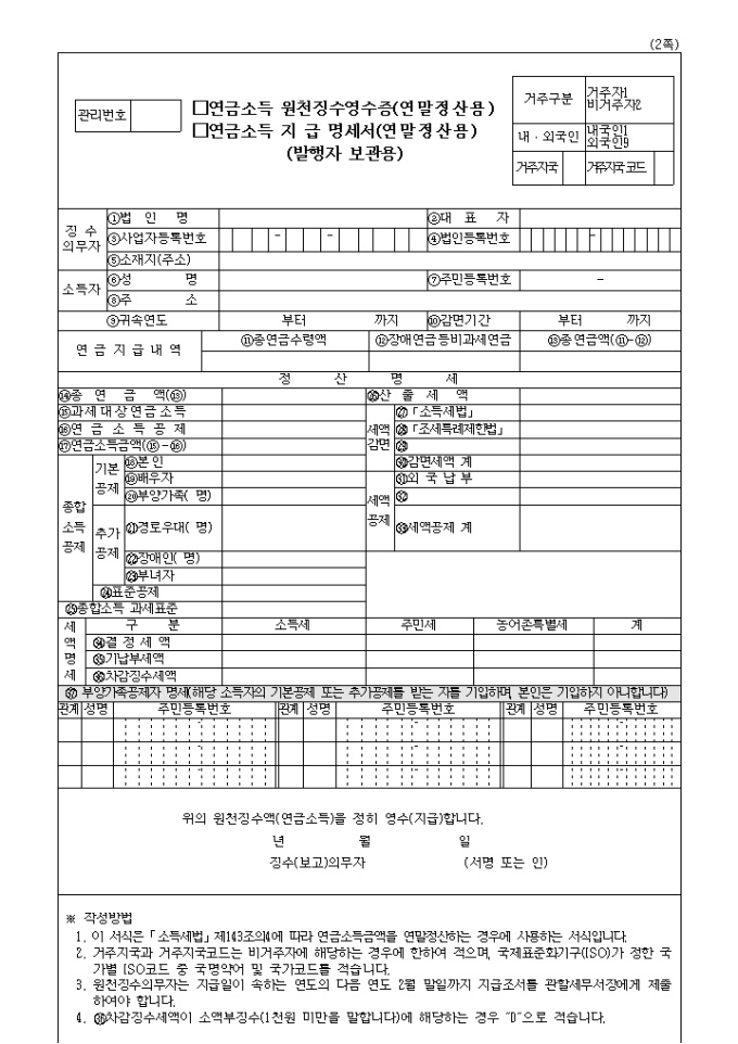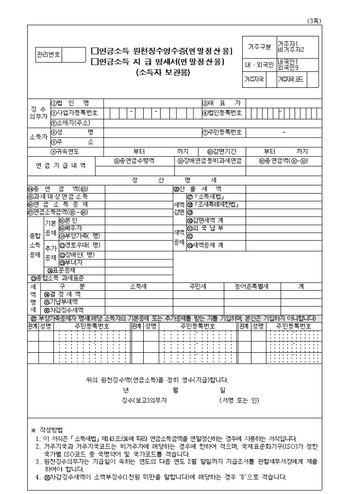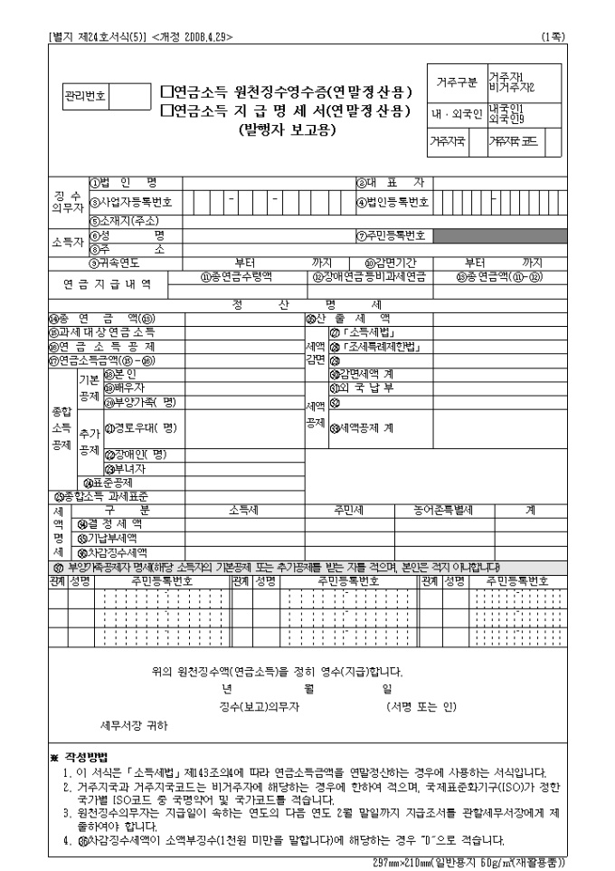 연금소득 원천징수영수증(연말정산용) 및 연금소득 지급명세서(연말정산용) 개정 서식입니다.(개정 2008.4.29)