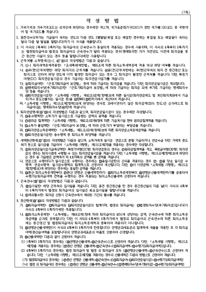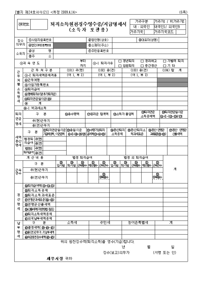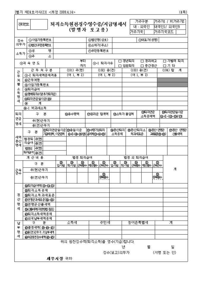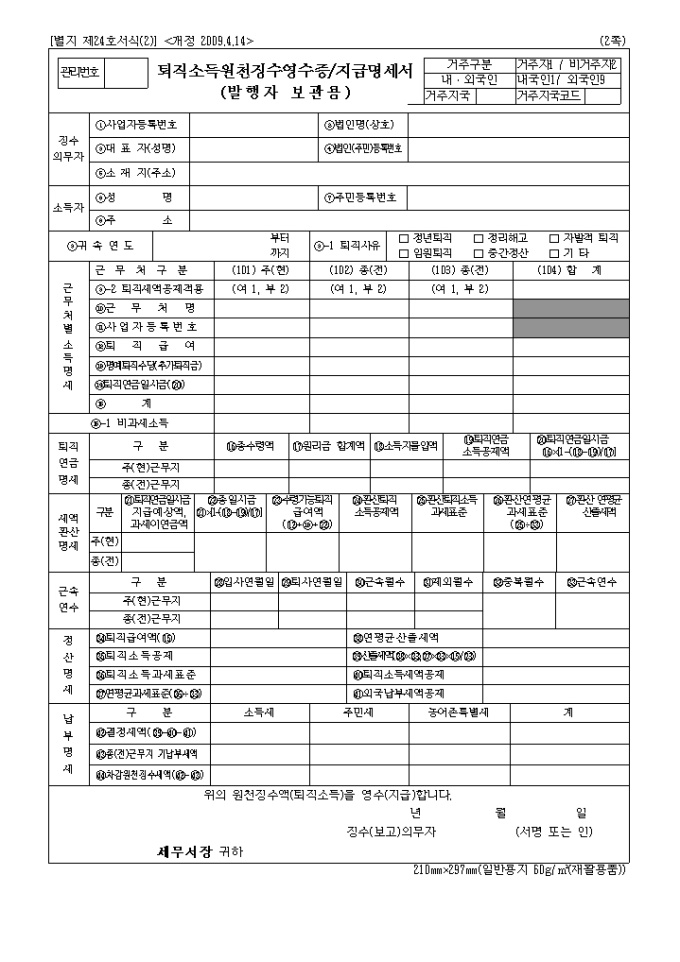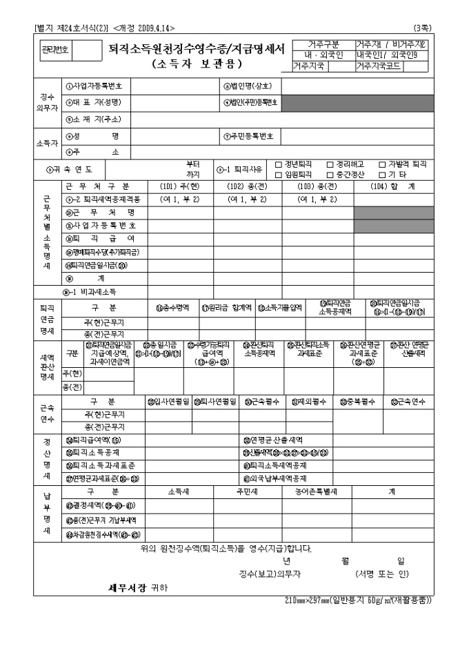 9,000원/월퇴직소득 원천징수영수증 및 지급명세서 개정 서식입니다.(개정 2009.4.14)