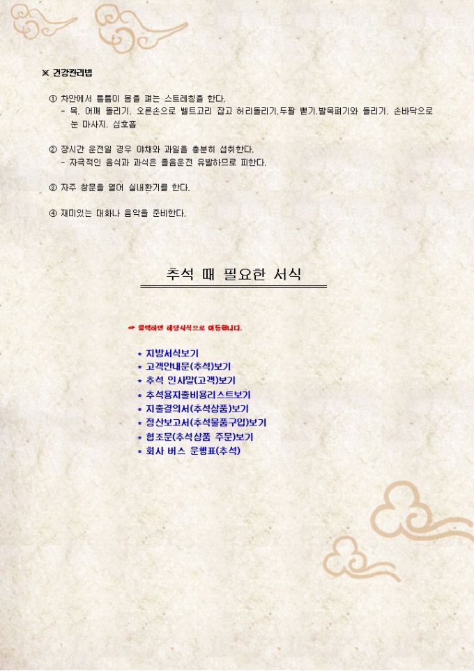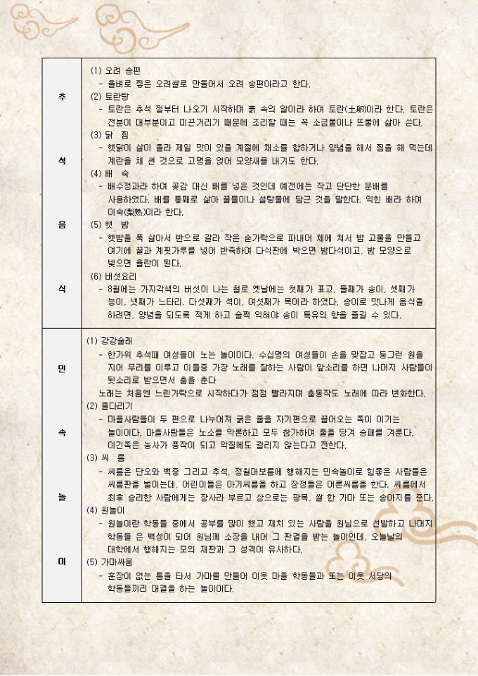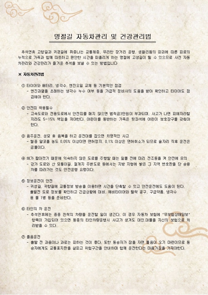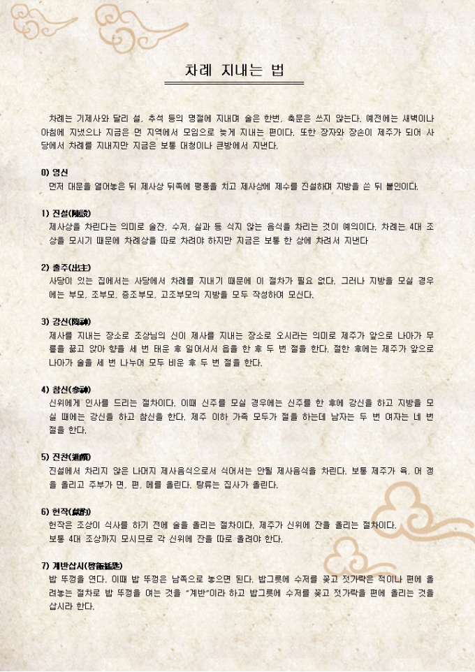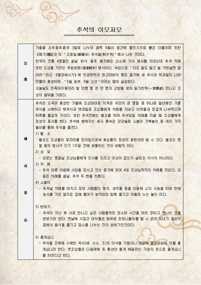 9,000원/월추석콘텐츠패키지입니다. 1. 차례상 차리는 법 2. 지방 쓰는 법 3. 차례 지내는 법 4. 차례 지낼 때 절하는 법 5. 추석의 이모저모(유래/세시풍습/민속놀이/음식) 6. 명절길 자동차관리 및 건강관리법 7. 추석때 필요한 서식