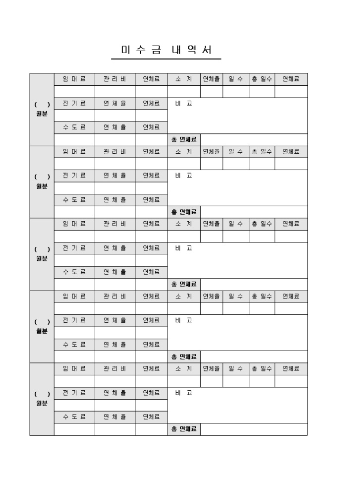 9,000원/월임대관리비 미수금 내역을 기록/ 관리할 수 있는 미수금 내역서입니다. 임대료, 관리비, 전기료, 수도료 등의 항목으로 구성되어있습니다.