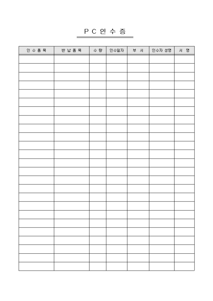 9,000원/월PC 인수 내역을 기록/ 관리할 수 있는 PC 인수증입니다. 인수품목, 반납품목, 수량, 인수일자 등의 항목으로 구성되어있습니다.