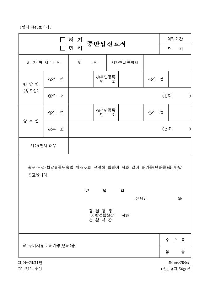 총포.도검.화약류등단속법 제65조의 규정에 의하여 위와 같이 허가증(면허증)을 반납 신고합니다.