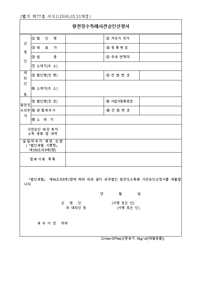 법인세법 제77호 원천징수특례사전승인신청서 20080331