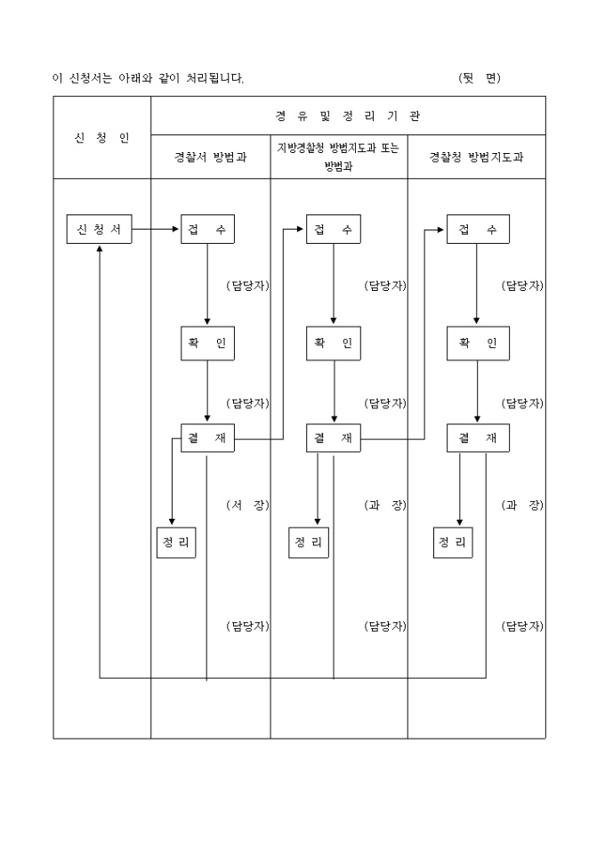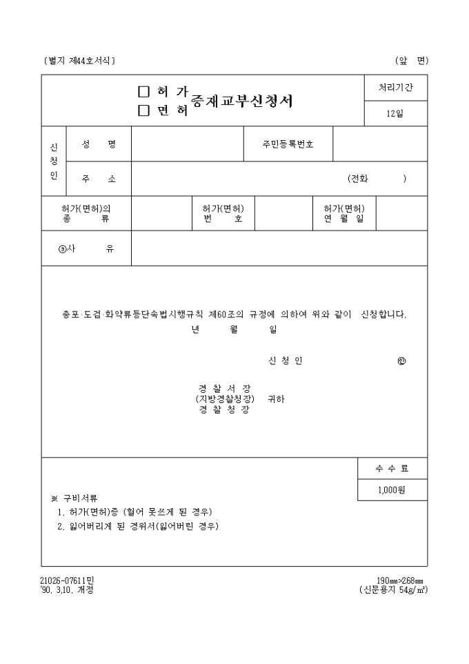 총포.도검.화약류등단속법시행규칙 제60조의 규정에 의하여 위와 같이 신청합니다.