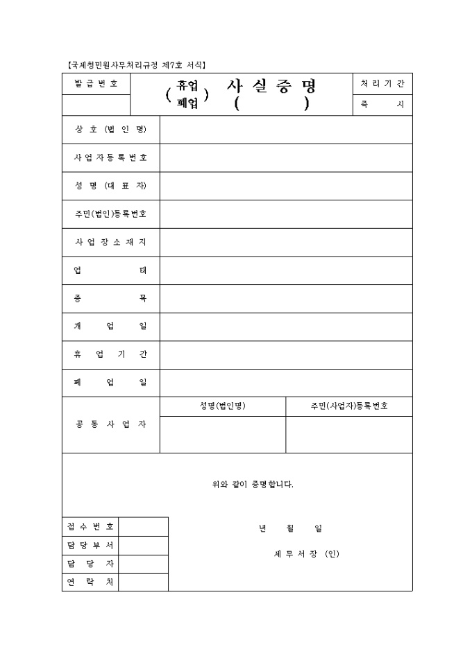 2007년2월1일에 개정된 국세청민원사무처리규정 제7호 휴업폐업사실증명 서식입니다.