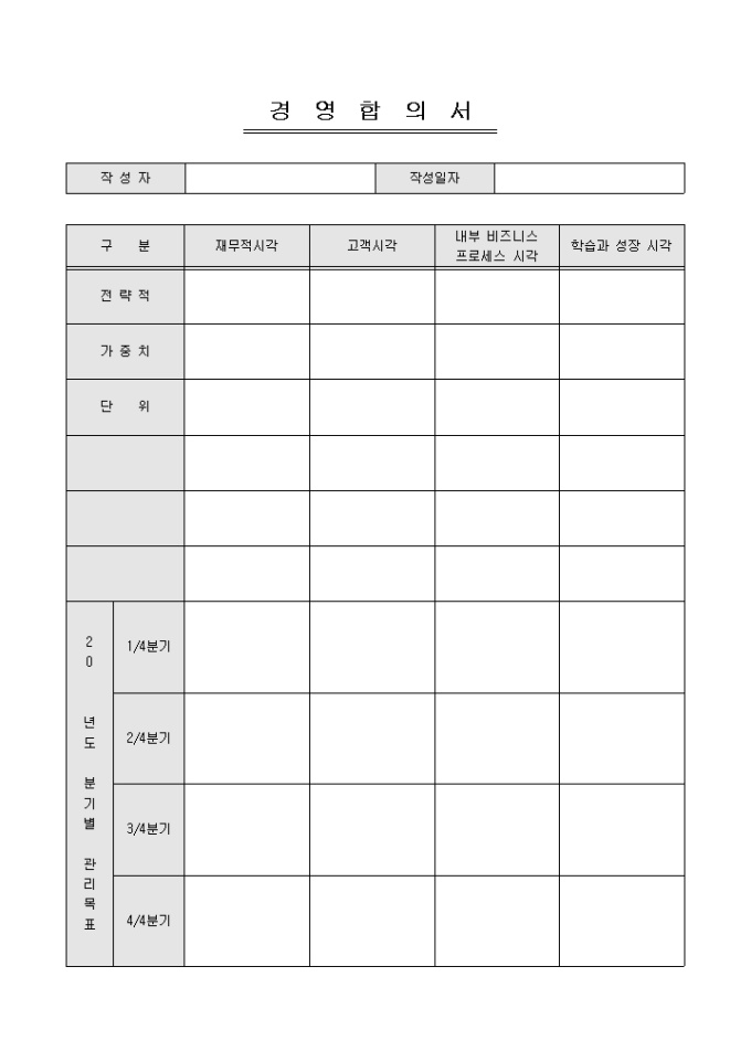 경영목표에 대한 합의 도출 시 사용할 수 있는 경영합의서입니다. 재무적시각, 고객시각, 전략적, 가중치 등의 항목으로 구성되어있는 경영합의서입니다.