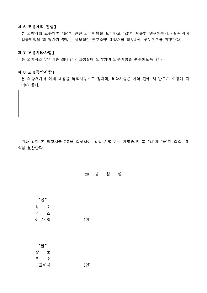9,000원/월상호간의 공동연구 의향을 교환하는 데 목적을 두고 작성되어있는 공동연구 의향서입니다. 목적, 시설준비, 인력지원, 연구계획서 등 8개 조항으로 구성되어있습니다.
