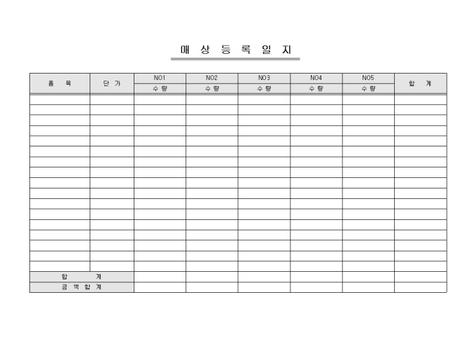 9,000원/월매상에 관한 내역을 등록/ 관리할 수 있는 매상등록일지입니다. 품목, 단가, 수량 등의 항목으로 구성되어있습니다.