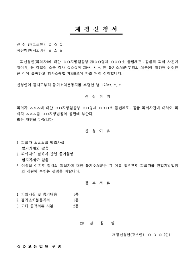 9,000원/월불법체포 및 감금죄 피의 사건에 대한 재정신청서 작성 예제입니다. 신청취지, 신청이유, 첨부서류 등의 항목으로 구성되어있습니다.