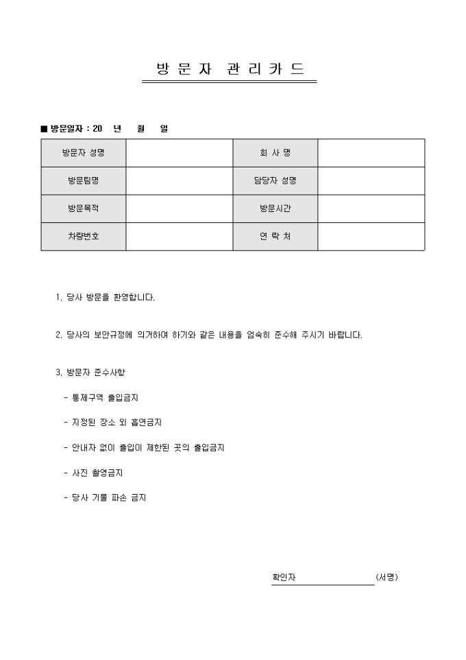 9,000원/월회사내 방문자에 대한 내역을 기록/ 관리할 수 있는 회사 방문자 관리카드입니다. 방문일자, 성명, 방문목적, 방문시간, 방문자 준수사항 등의 항목으로 구성되어있습니다.