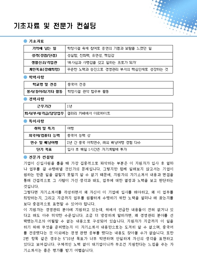 기업이 신입사원을 뽑을 때 가장 집중적으로 파악하는 부분은 이 지원자가 입사 후 얼마나 업무를 잘 수행해낼 것인가의 문제입니다.