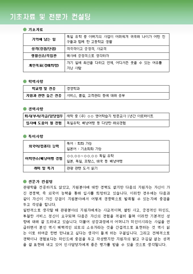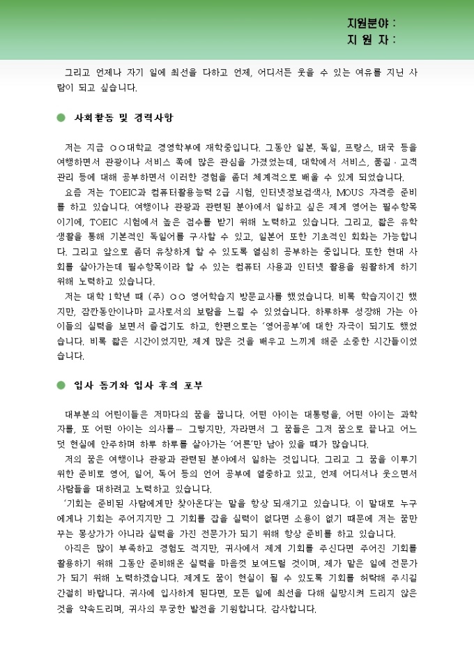 관광학을 전공하지도 않았고, 지원분야에 대한 경력도 없지만 다음의 지원자는 자신이 가진 경쟁력, 즉 외국어 능력을 통해 입사를 희망하고 있습니다.