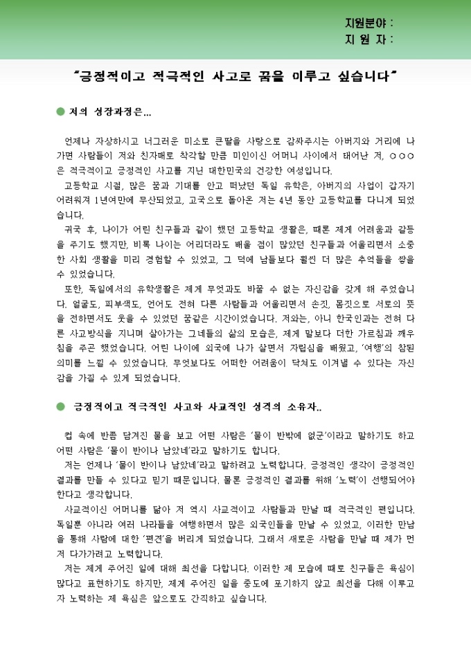 이러한 경우에는 다음과 같이 자신이 가진 강점이 지원분야에서 어떻게 경쟁력으로 발휘될 수 있는지에 중점을 두고 작성을 합니다.