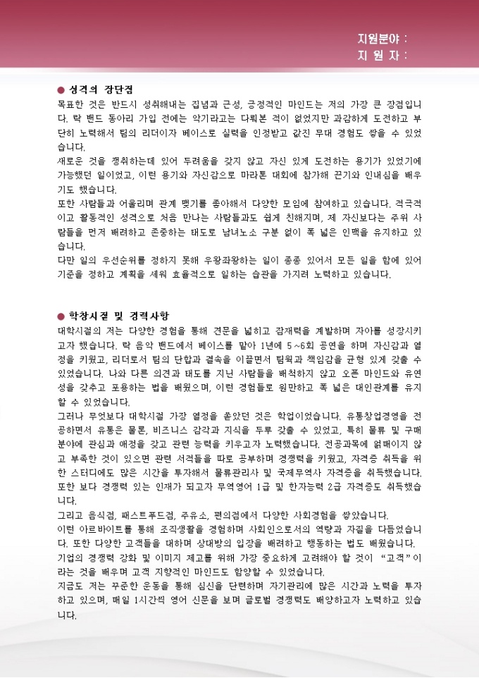 자기소개서 작성 시 대부분의 많은 지원자들이 놓치는 것 중의 하나가 자신의 성격이나 각오를 뒷받침해 줄 수 있는 증거나 구체적 사례를 들지 않고 단순히 추상적이고 포괄적인 내용으로 자기소개서 작성을 마무리한다는 것입니다.
