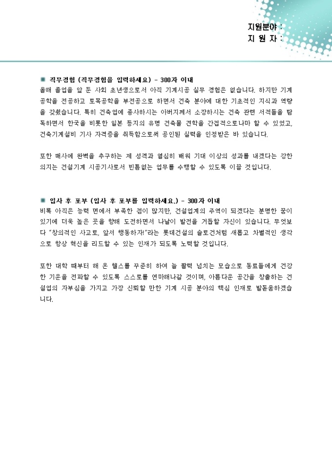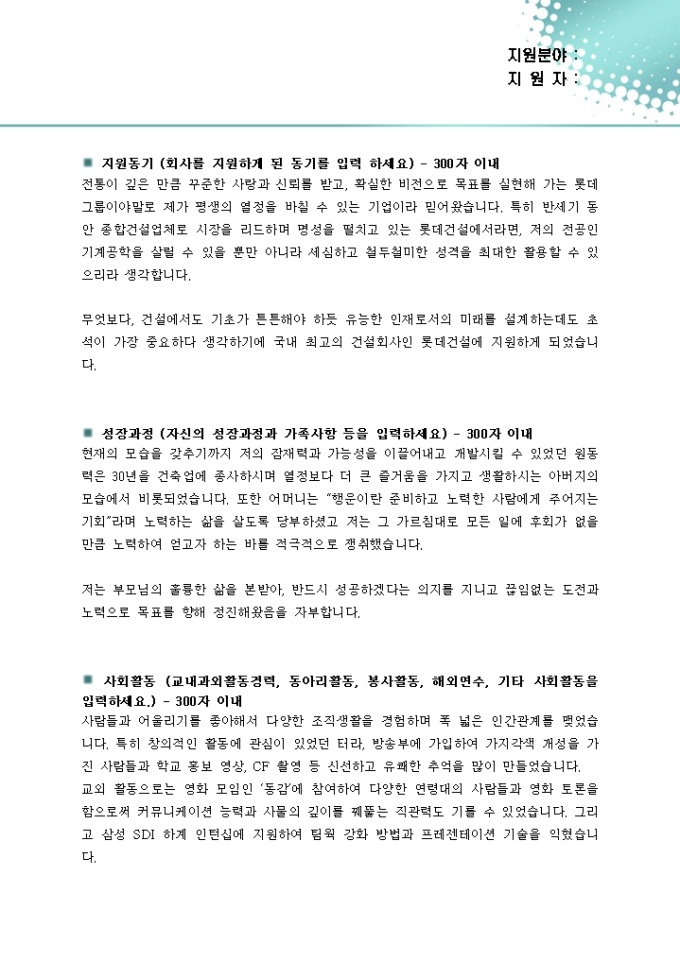 이런 경우 구직자가 자신의 장점이나 특징을 돋보이게 하기 위해 지나치게 많은 경험에 대해 언급하게 되는데, 이는 오히려 장점을 살리기 보다 산만하고 특징이 없다는 인상을 줄 수 있습니다.
