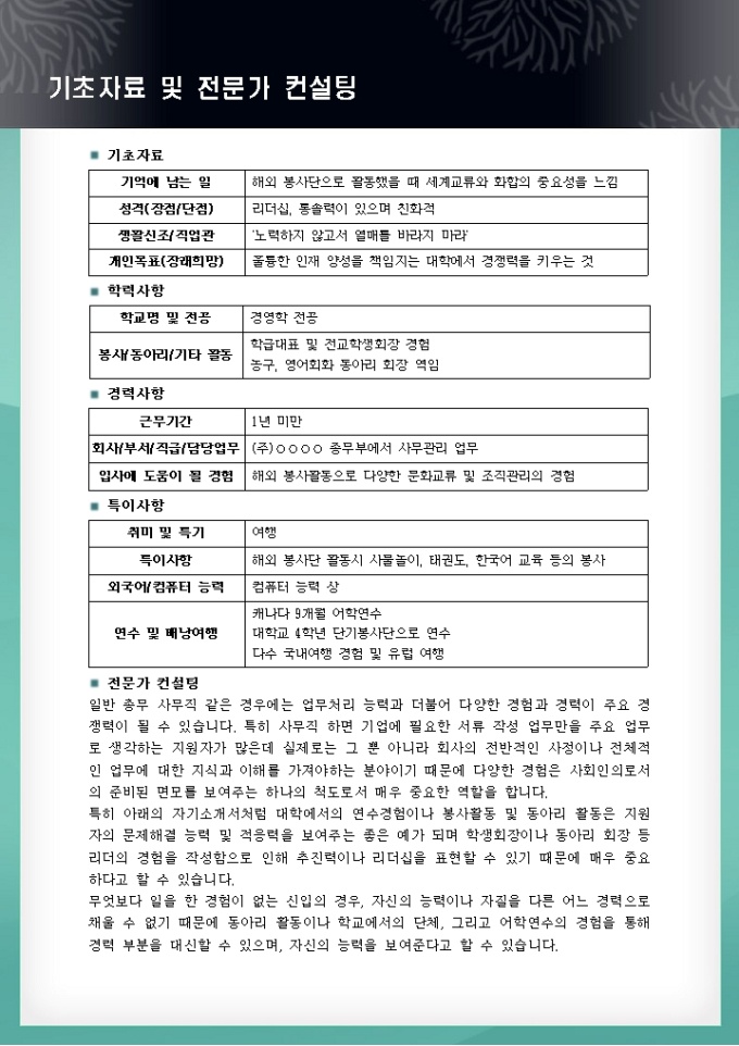 특히 사무직 하면 기업에 필요한 서류 작성 업무만을 주요 업무로 생각하는 지원자가 많은데 실제로는 그 뿐 아니라 회사의 전반적인 사정이나 전체적인 업무에 대한 지식과 이해를 가져야하는 분야이기 때문에 다양한 경험은 사회인의로서의 준비된 면모를 보여주는 하나의 척도로서 매우 중요한 역할을 합니다.