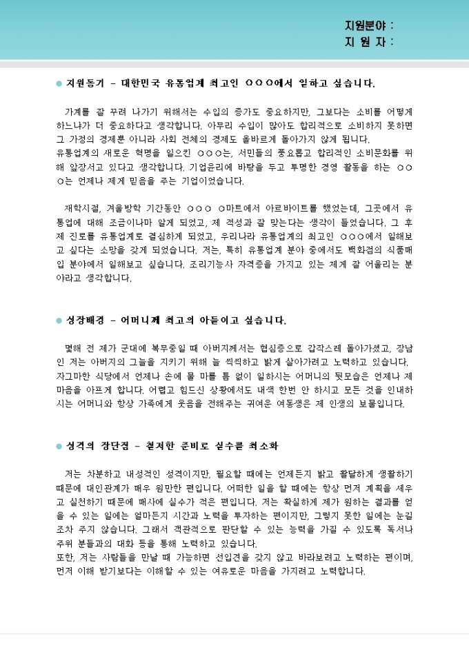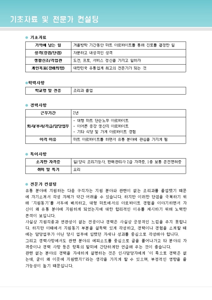하지만 이러한 단점을 극복하기 위해 ´지원동기´를 서두에 배치하고, 대형 마트에서의 아르바이트 경험을 이야기하면서 자신이 왜 유통 분야에 지원하게 되었는지에 대한 합리적인 이유를 제시하기 위해 노력한 흔적이 보입니다.