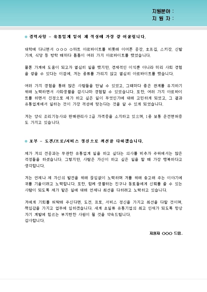 9,000원/월유통 분야에 지원하는 다음 구직자는 지원 분야와 관련이 없는 조리과를 졸업했기 때문에 자기소개서 작성 자체가 약간 어려울 수 있습니다.