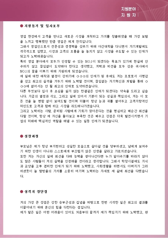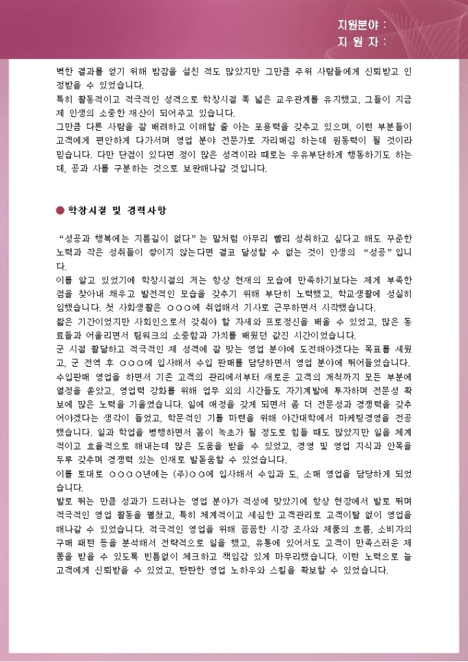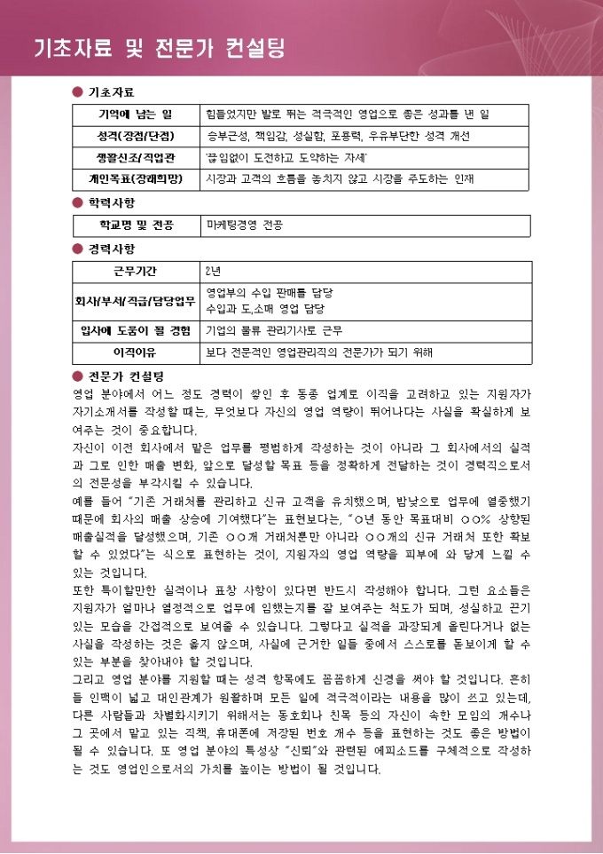 9,000원/월영업 분야에서 어느 정도 경력이 쌓인 후 동종 업계로 이직을 고려하고 있는 지원자가 자기소개서를 작성할 때는, 무엇보다 자신의 영업 역량이 뛰어나다는 사실을 확실하게 보여주는 것이 중요합니다.
