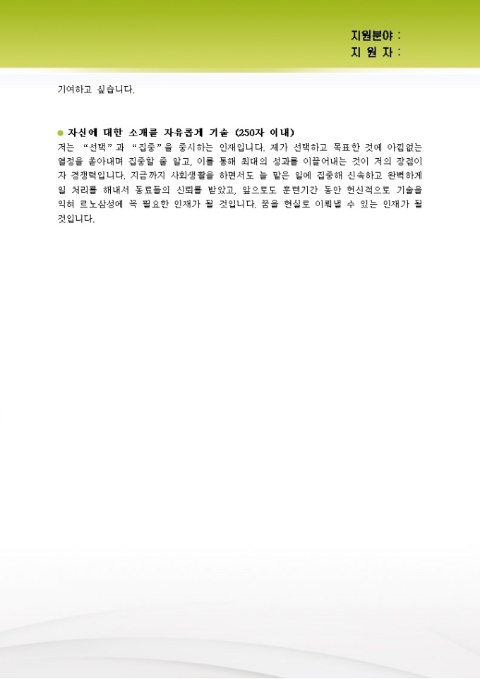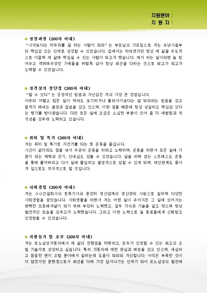 특히 아래의 자기소개서처럼 항목은 다양한데 글자수가 짧게 제한되어 있다면 더욱 필요한 부분입니다. 대부분의 지원자들은 자기소개서를 통해 조금이라도 자신을 더 보여주려고 애쓰게 됩니다.