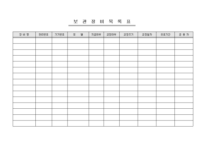 9,000원/월보관장비내역을 기록/ 관리할 때 사용할 수 있는 보관장비목록표입니다. 장비명, 관리번호, 기기번호, 모델, 지급여부 등의 항목으로 구성되어있습니다.
