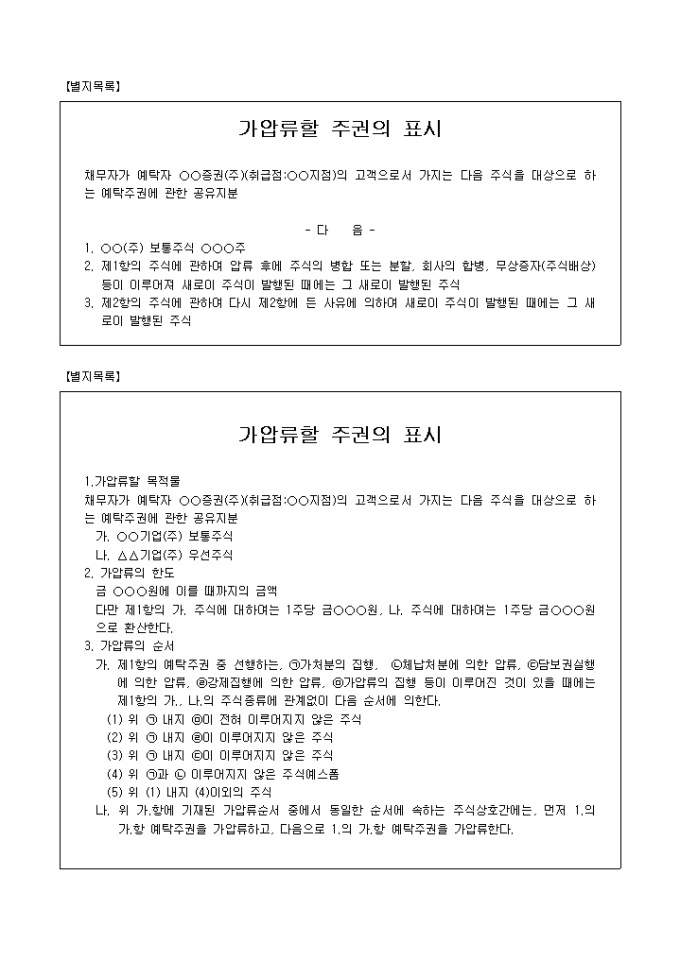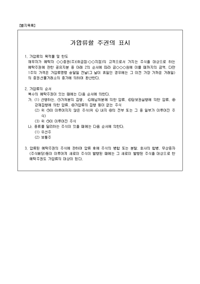 9,000원/월가압류할 채권 및 주권의 표시 별지목록을 작성해놓은 가압류할 채권 및 주권의 표시 샘플입니다.
