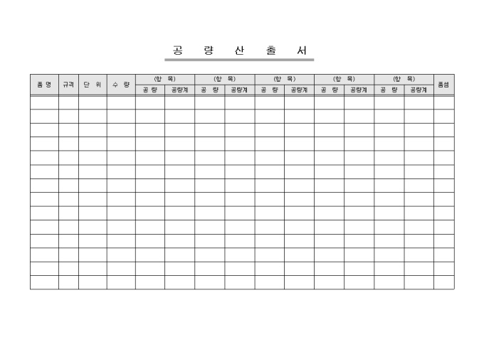 9,000원/월공량산출시 사용할 수 있는 공량산출조서입니다. 품명, 규격, 단위, 수량, 공량, 공량계 등의 항목으로 구성되어있습니다.