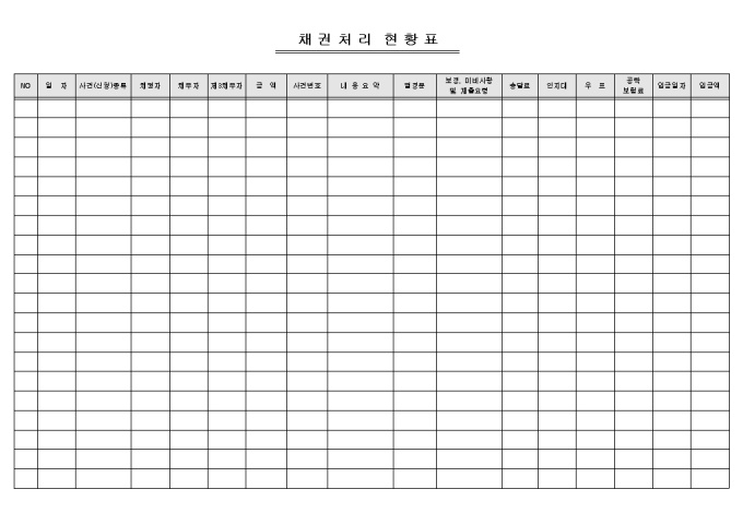 채권처리 현황을 기록/ 관리할 수 있는 채권처리 현황표입니다. 일자, 사건종류, 채권자, 채무자, 금액 등의 항목으로 구성되어있습니다.