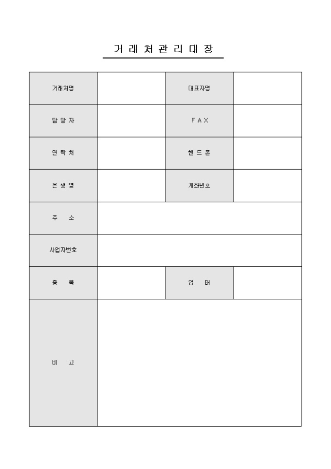 거래처 관리시 사용할 수 있는 거래처관리대장입니다. 거래처명, 담당자, 연락처, 은행명, 주소 등의 항목으로 구성되어있습니다.