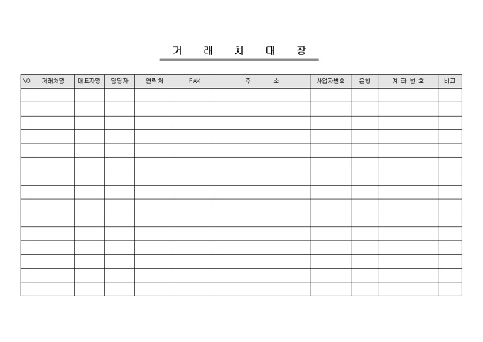 여러 거래처를 일괄적으로 관리할 수 있는 거래처대장입니다. NO, 거래처명, 대표자명, 담당자, 연락처 등의 항목으로 구성되어있습니다.