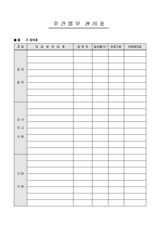 경리의 주간업무 관리 시 사용할 수 있는 주간업무 관리표입니다. 과업, 과업세부내용, 담당자, 달성율 등의 항목으로 구성되어있습니다.