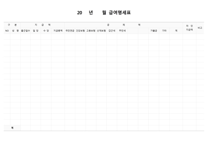 9,000원/월일용직 근로자용 급여명세표입니다. 성명, 출근일수, 일당, 수당, 공제액 등의 항목으로 구성되어있습니다.