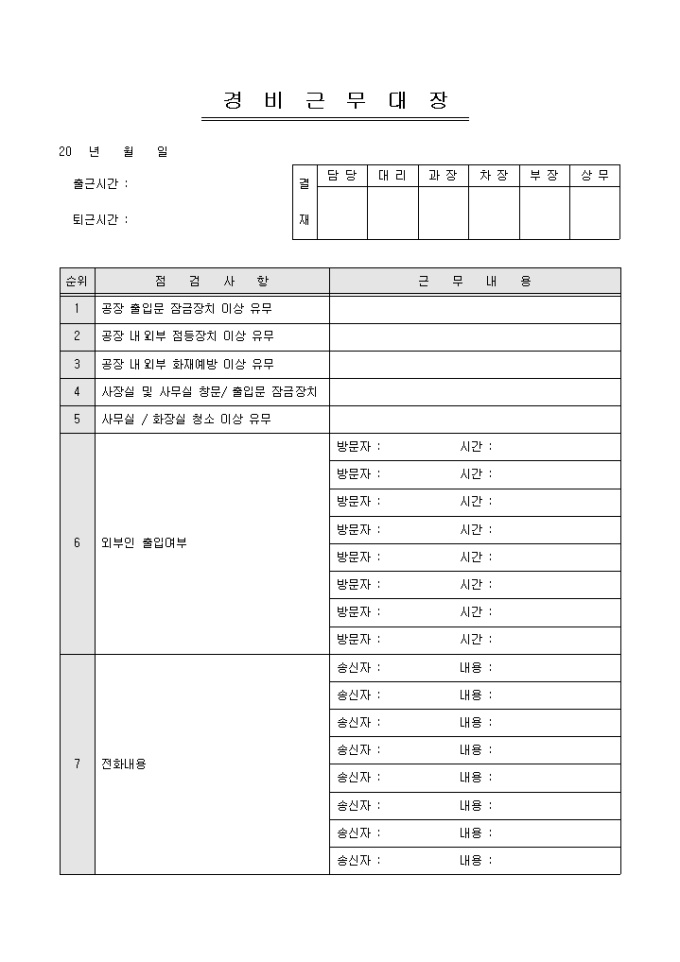 회사 경비원 근무내역을 기록/ 관리할 수 있는 경비원 근무대장입니다. 순위, 점검사항, 근무내용 등의 항목으로 구성되어있습니다.