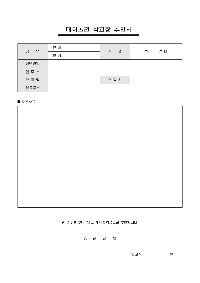 9,000원/월대회출전에 학교장이 추천할 때 사용할 수 있는 학교장 추천서입니다. 성명, 성별, 주소, 학교명, 추천사유 등의 항목으로 구성되어있습니다.
