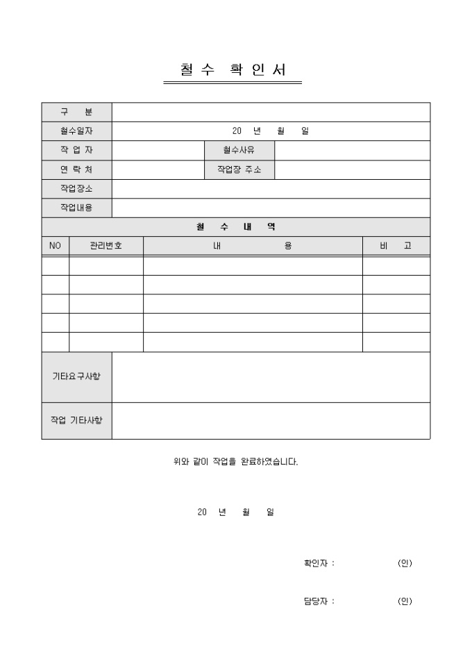 9,000원/월장비 및 기기 철수 확인 시 사용할 수 있는 철수 확인서입니다. 구분, 철수일자, 작업자, 작업장소, 철수내역 등의 항목으로 구성되어있습니다.